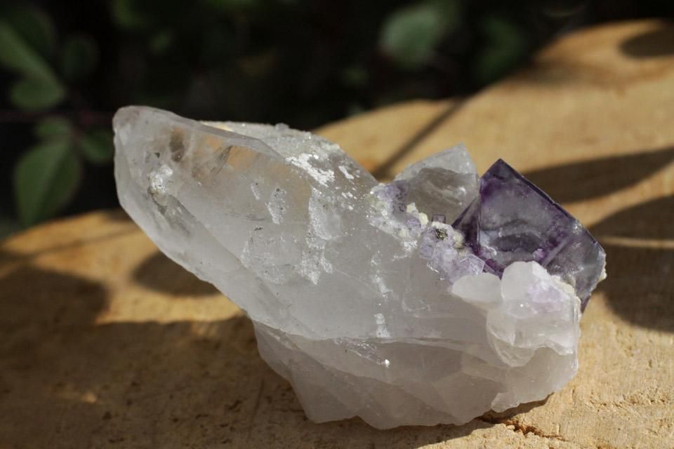 水晶ポイントにの根元に共生するパープルとブルーグリーンのバイカラーフローライト。